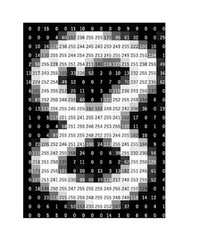 • The pixel values can vary from 0 to 255 and represent the intensity of each pixel. The range from 0 to 255 is chosen since exactly this number of values (256) can be stored in one byte (8 bits). 0 stands for black color, and 255 stands for white.