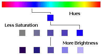 The picture below represents the difference between hue, saturation, and brightness.