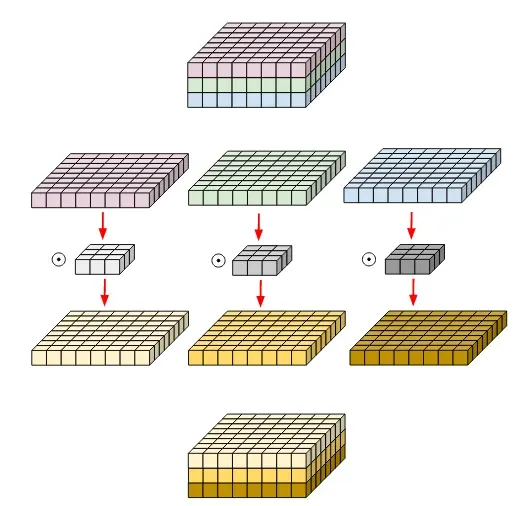 Next comes depthwise convolution. Remember that convolution kernels have the same depth as the input, and convolving with such kernels produces an output of depth 1? That is not the case for depthwise convolutions. Depthwise convolution applies different kernels of depth 1 to each input channel separately and then stacks results together again.