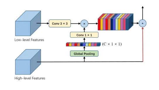 The pyramid attention module fuses features from under three different pyramid scales. Here they use three convolutions (7X7, 5X5, 3X3) to extract the context. We can see that the original feature is multiplied by the pyramid attention features after passing through a 1X1 convolution. Benefiting from spatial pyramid structure, the Feature Pyramid Attention module can fuse information from different scale contexts and produce better pixel-level attention for high-level feature maps.