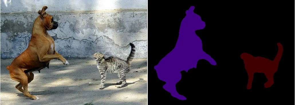 Semantic Segmentation is a Computer Vision task that focuses on classifying every pixel in an image to create a pixel-perfect segmentation map for a specific image. Here is a simple example of how such a map might look like: