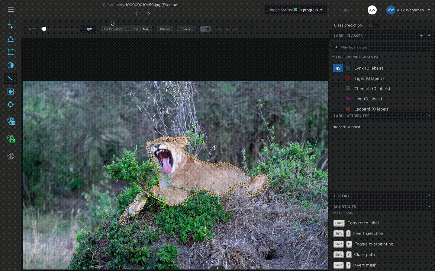 When using the brush, most users often start by first painting the outline before filling in everything in between. In Hasty however, you don't need to fill in your annotation manually. Just press the "Fill closed path" button in the tool menu or press "Shift" + "F". This will fill in all of the area in-between as long as the outline is 100% closed.