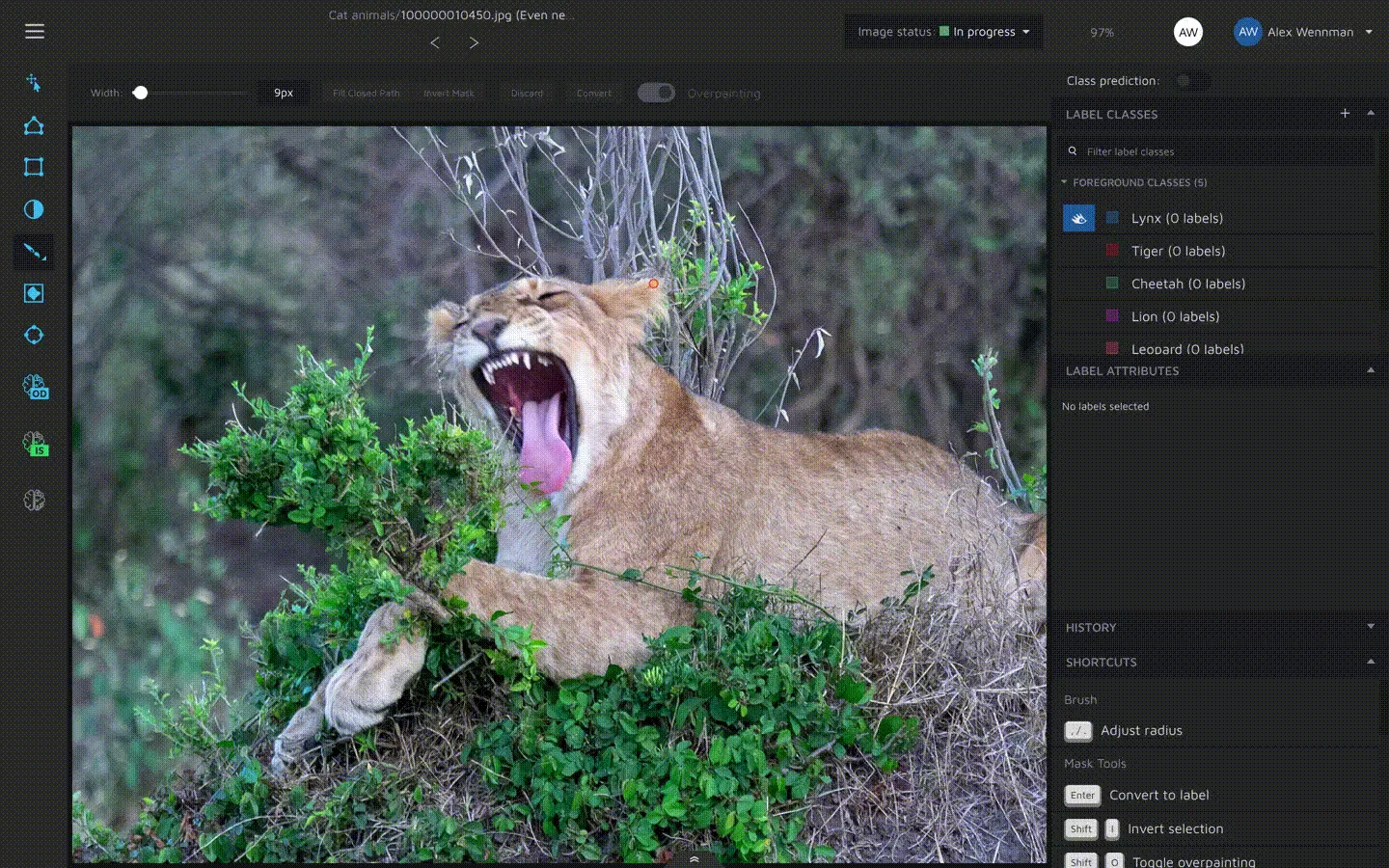 When using the brush, you are creating one annotation at a time. That means that from when you start using the brush, until you convert the selection you made with the brush into an actual annotation, everything you paint will be part of one annotation. This is also true even if the areas you have painted or not connected. In theory, you can paint hundreds of stand-alone areas and then convert all of them to one annotation. This is important to know when you are annotating objects that have occlusion.