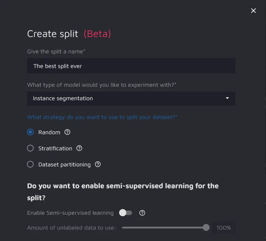 - Semi-Supervised Learning - this feature is available for Object Detection and Instance Segmentation tasks. Toggle it on to enable the feature.