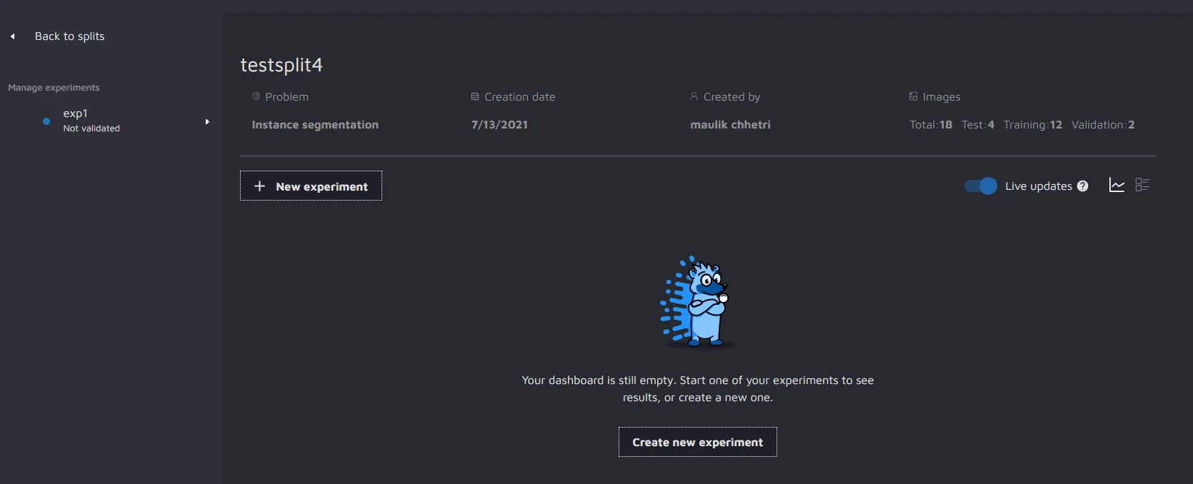 All the existing experiments can be viewed at the left sidebar. Here exp1 has been created.