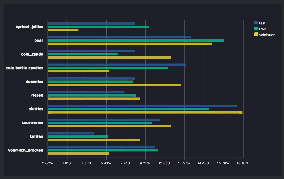 For the label class prediction split, the user is able to view the distribution of the different labels in the test, train, and validation set.