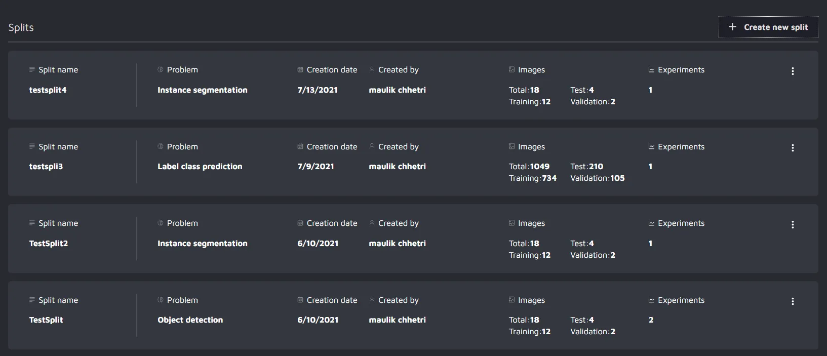 After creating a split for a particular machine learning task with given sets of data, the user is able to see the overview of the split. There can be multiple splits for the same dataset and different tasks. For example, a car dataset with 10000 images can have 8000 images for training, 1000 for testing, and the rest 1000 for validation. It can also have another split with varying numbers of training, testing, and validation data.
