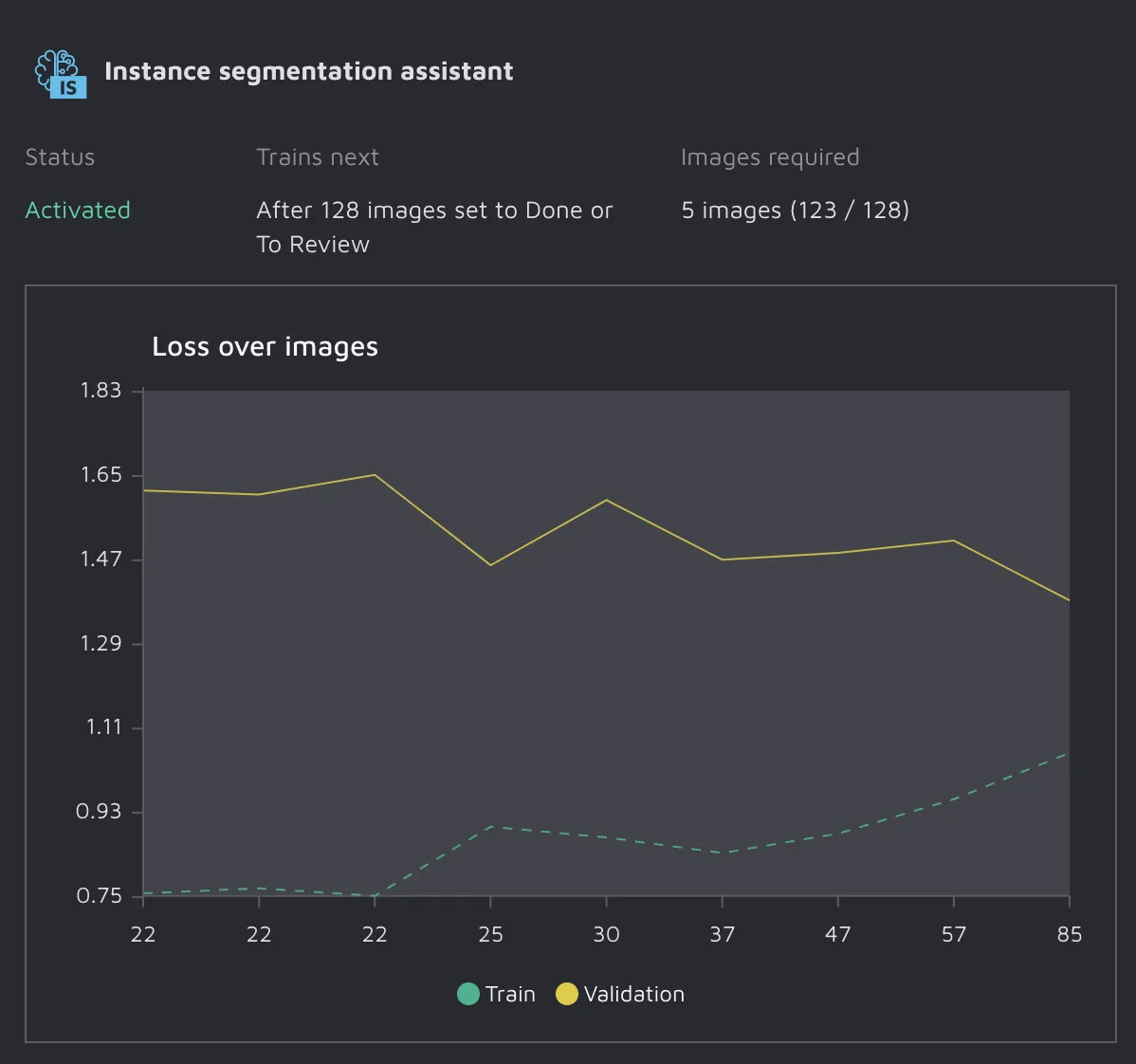 Here's an example from an internal demo project we did for a customer demo. What we see is the training loss starting very low with our validation loss being much higher. As we continued to annotate, we got the two metrics converging closer to each other, indicating a better-performing model.