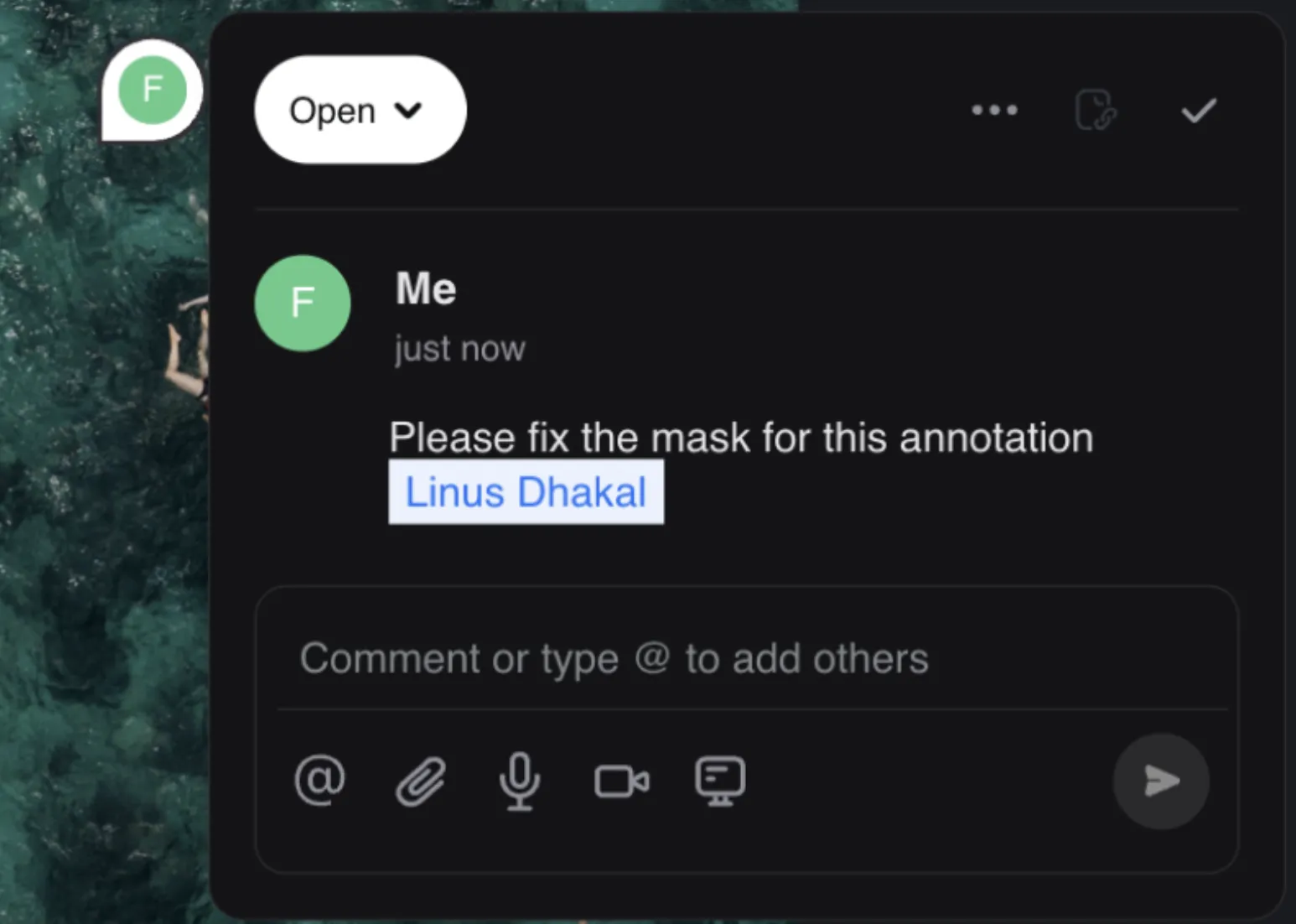 You can also assign the comment to a user if you want them to perform an action described in the comment. If a text comment is not enough and needs some extra information, the user can add attachments (image, video, screen recording, or voice recording)