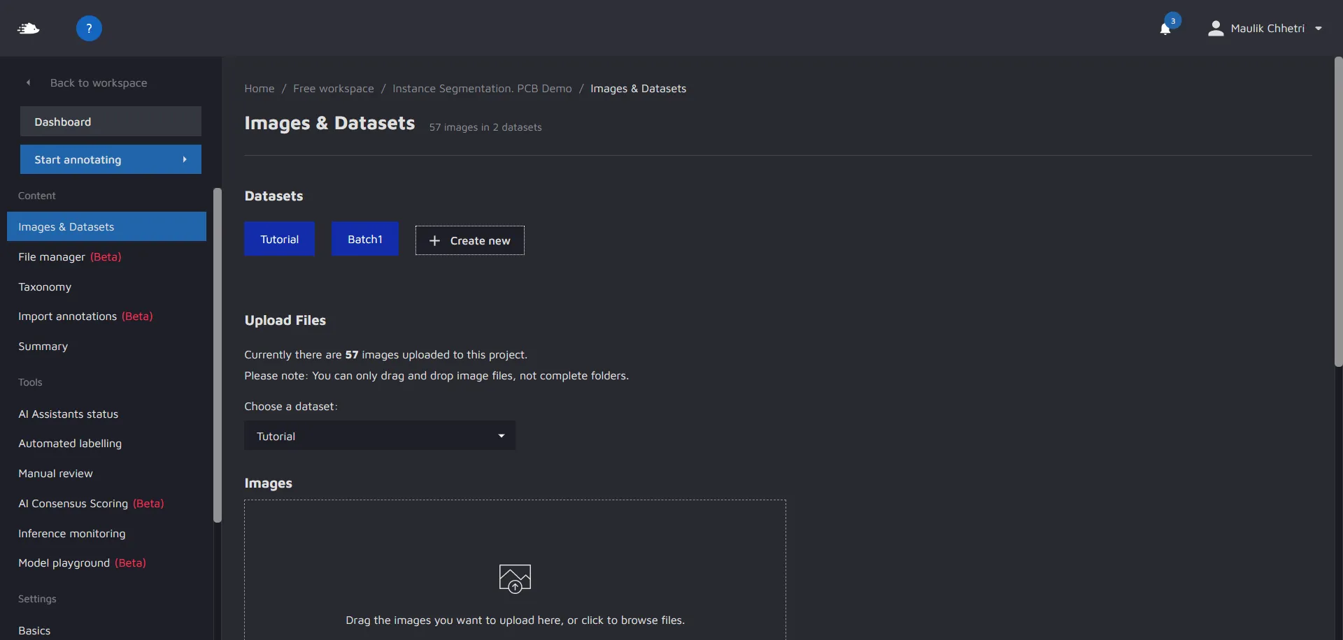 Before you upload, click on the dropdown menu above the drop area to select which dataset you want to upload your images to. Please note that you can only upload images to one dataset at a time.