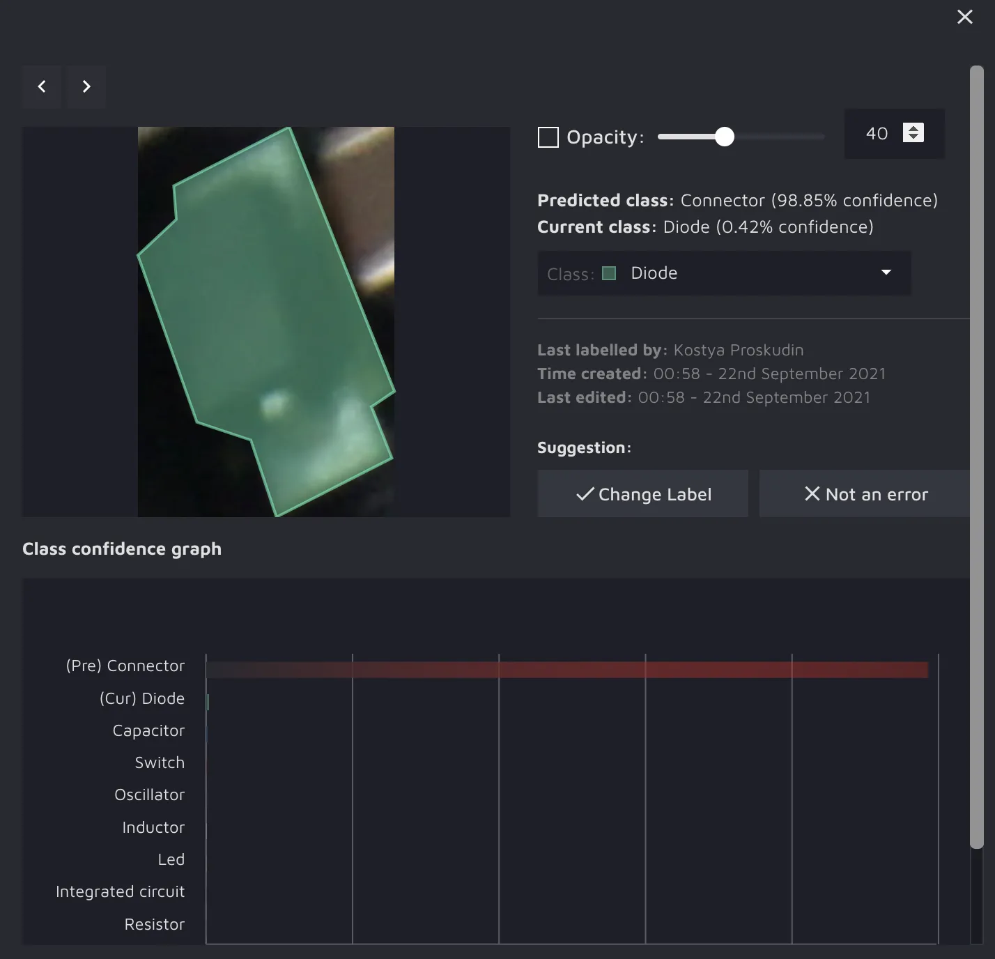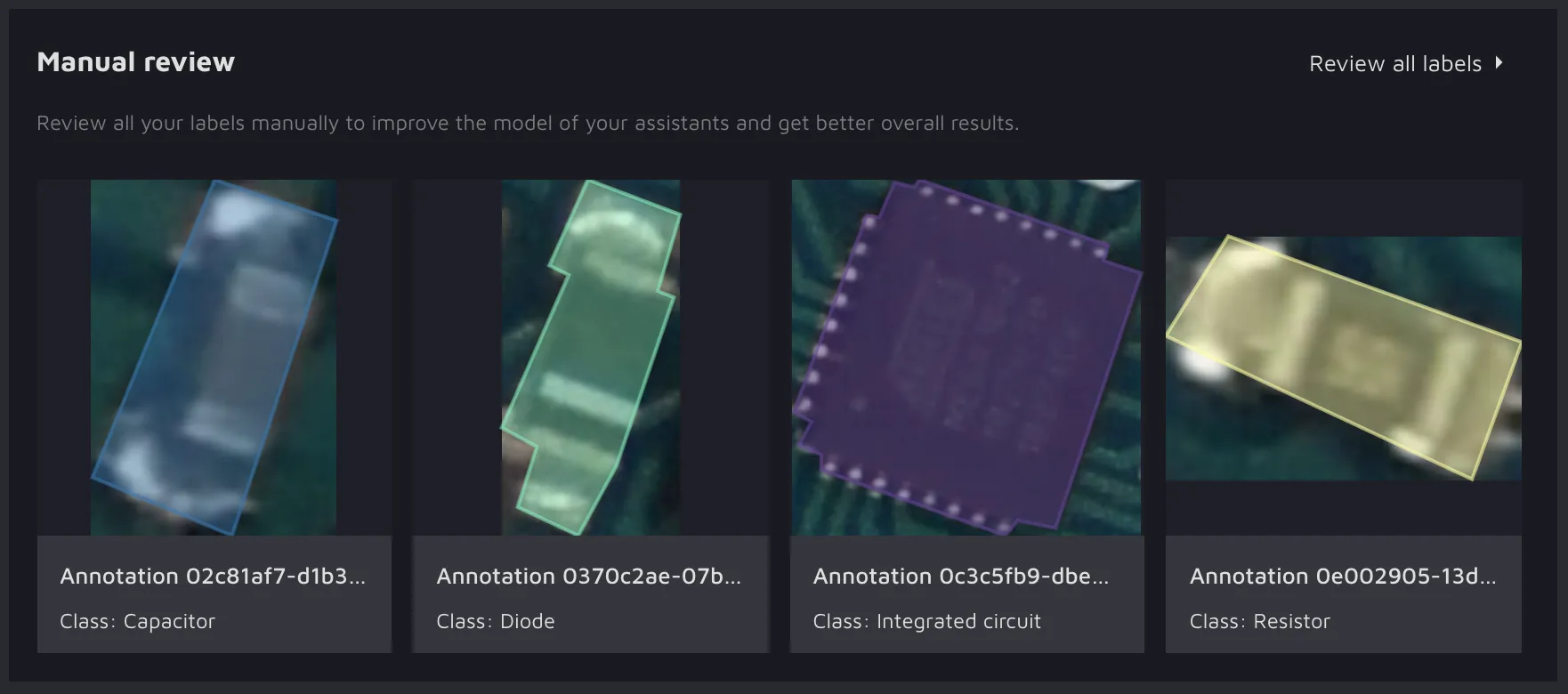 With the Manual Review feature, you can manually review all your annotations to find the potential mistakes, correct them, improve your assistants, and get better overall results. The preview of the labels will appear in the Dashboard as soon as you start annotating. Please click on the "Review all labels button" to fully get into the manual review.