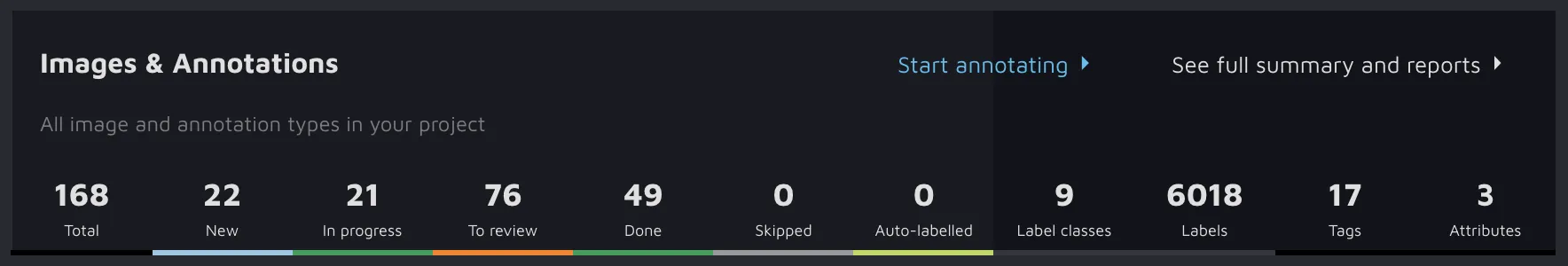 • The number of images marked as New / In progress / To review / Done / Skipped / Auto-labelled: The total number of images set to a specific image status;