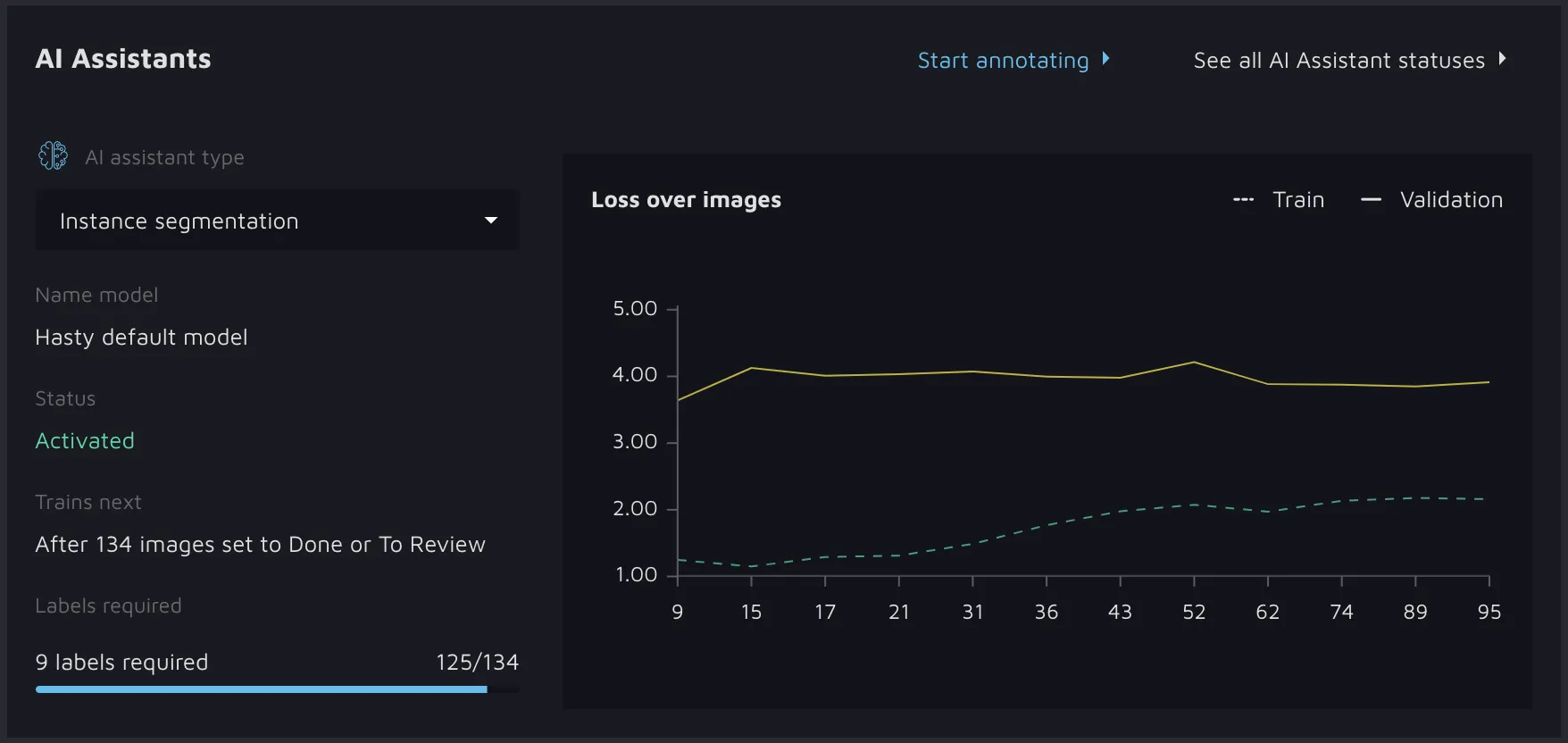 In the Annotation & Automation section, you can keep track of your annotation progress and check the status of the tools that help you with that - AI Assistants.