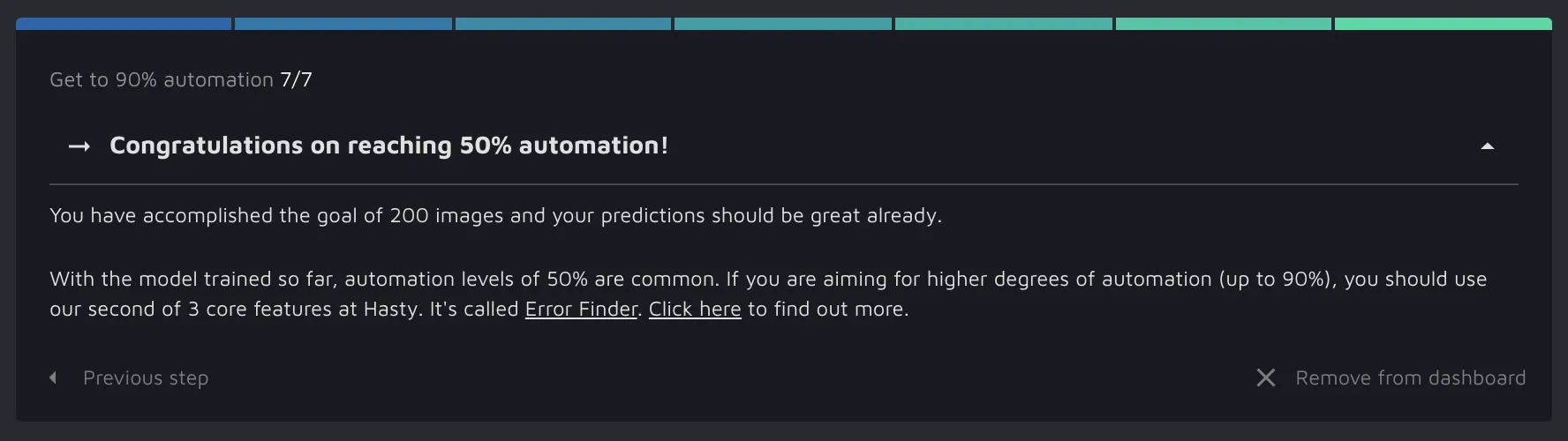 The first thing you will see in the Dashboard right after the general information is our newest user guide widget that will provide you with instructions on reaching 90% of automation.