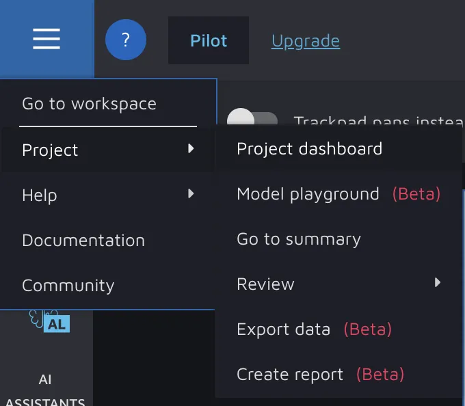 • Second, if you are in the annotation environment, you can get to the Dashboard through the Upper-Left Corner Button => Project => Project dashboard.