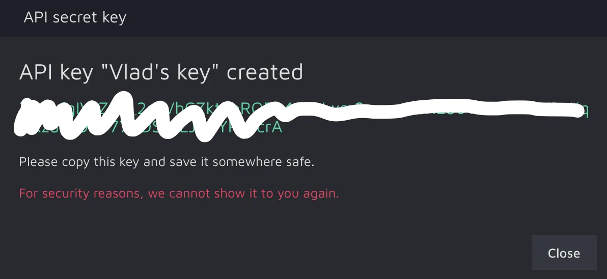 Your API key is ready. Please, make sure to copy and save it as you will not see it once again for security reasons. If you ever lose the key, simply generate the other one.