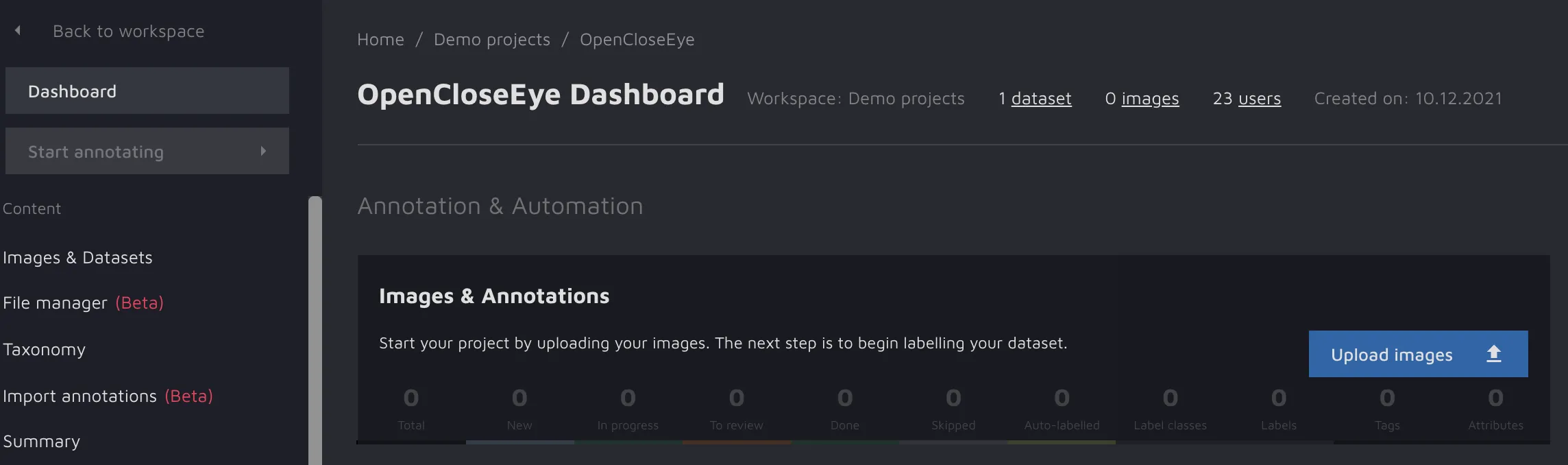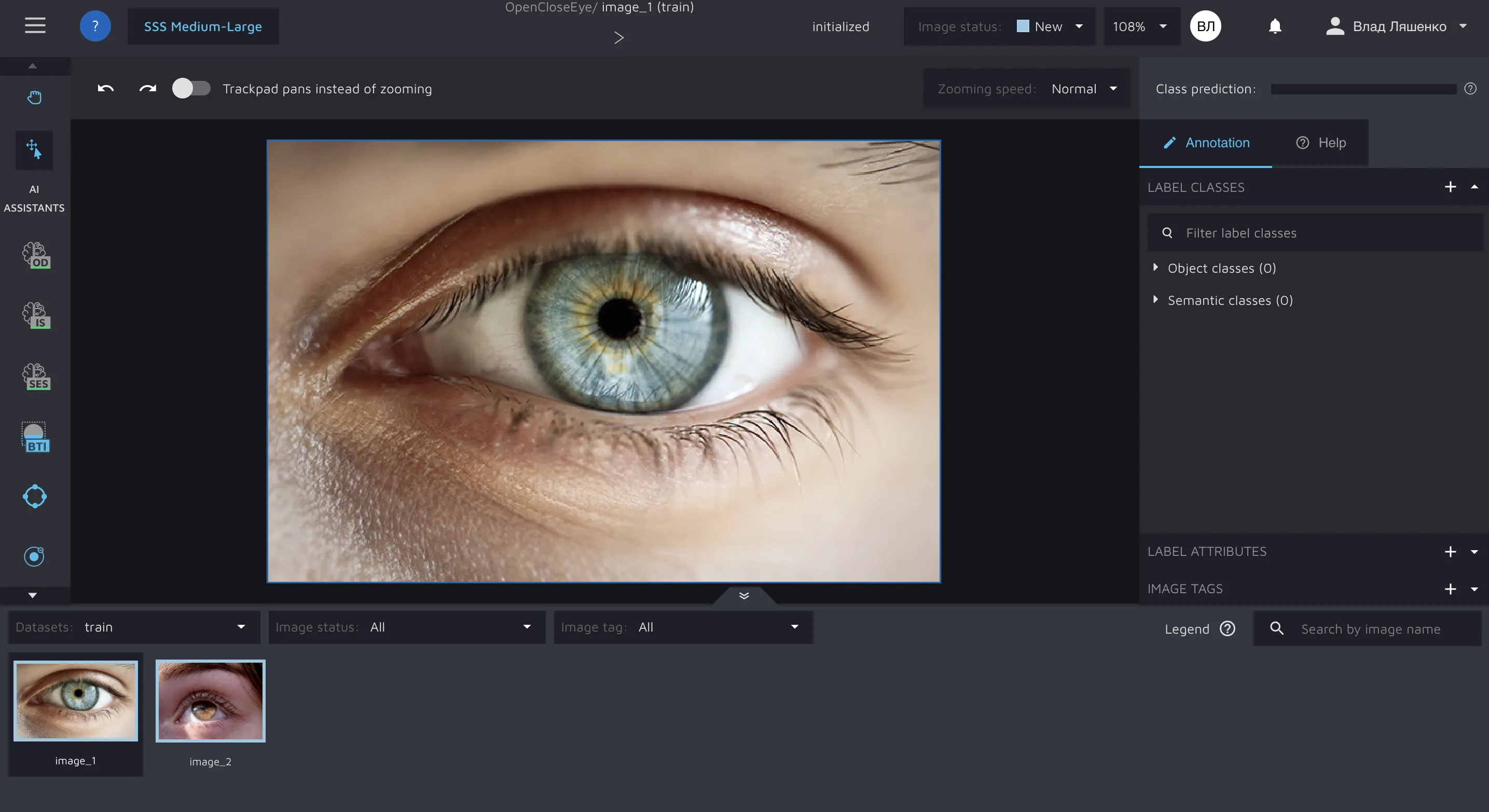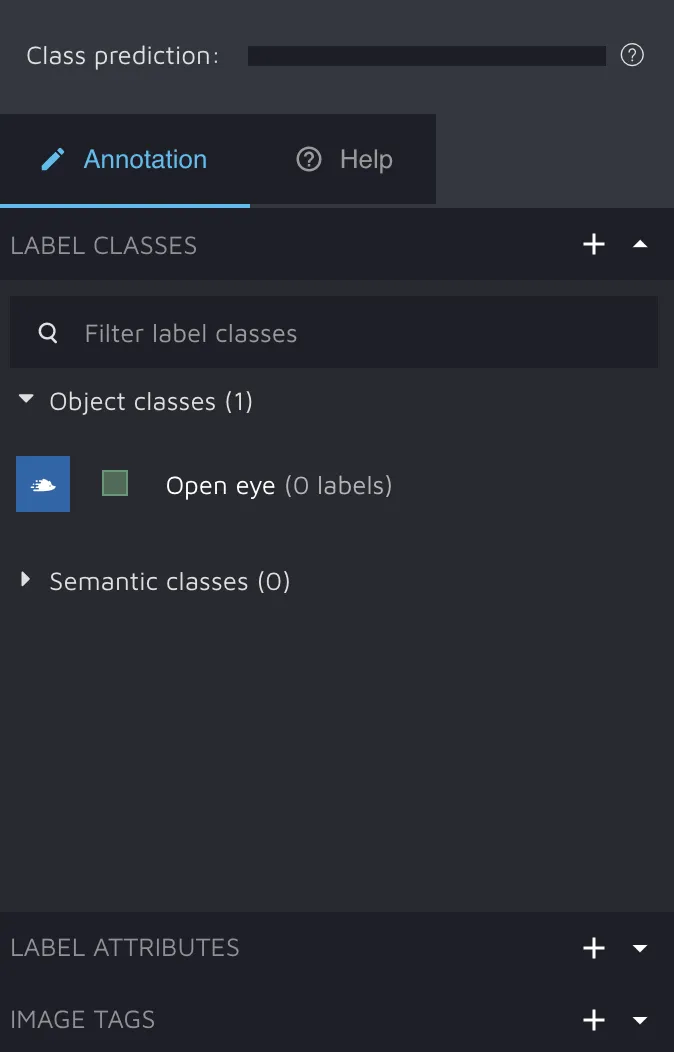 To further work with images, we need to create labels and annotate the images. In the previous section, we have imported two cropped images of an open human eye. Let’s create the Open eye labeling class through the Hasty API.