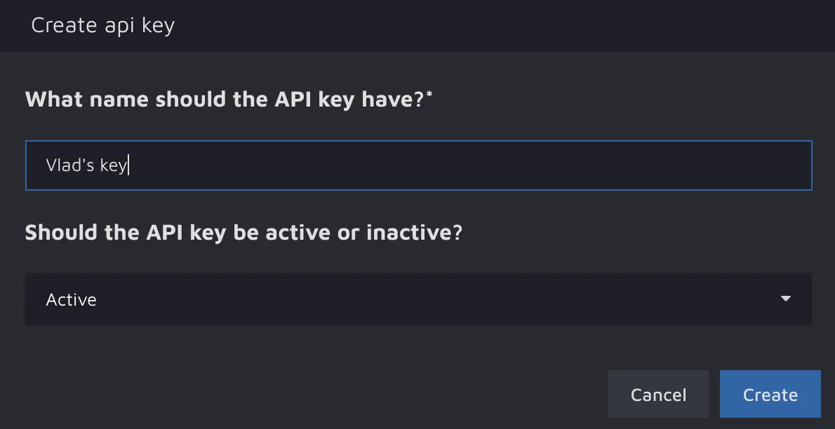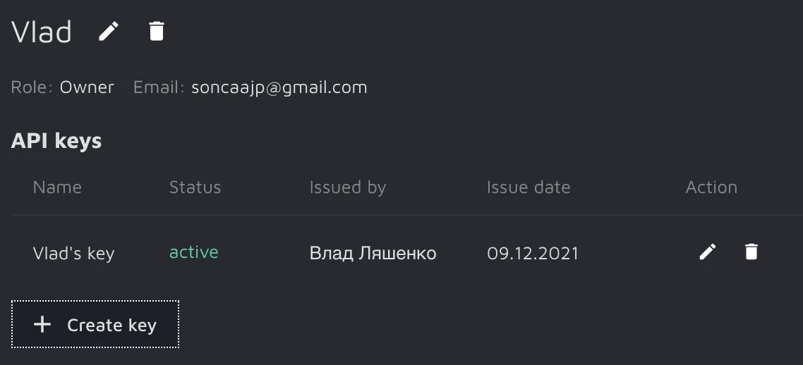 The account you have just created will appear on the same page below. To generate the key, press the Create key button, fill in the key’s name, make sure the key is Active, and press Create.