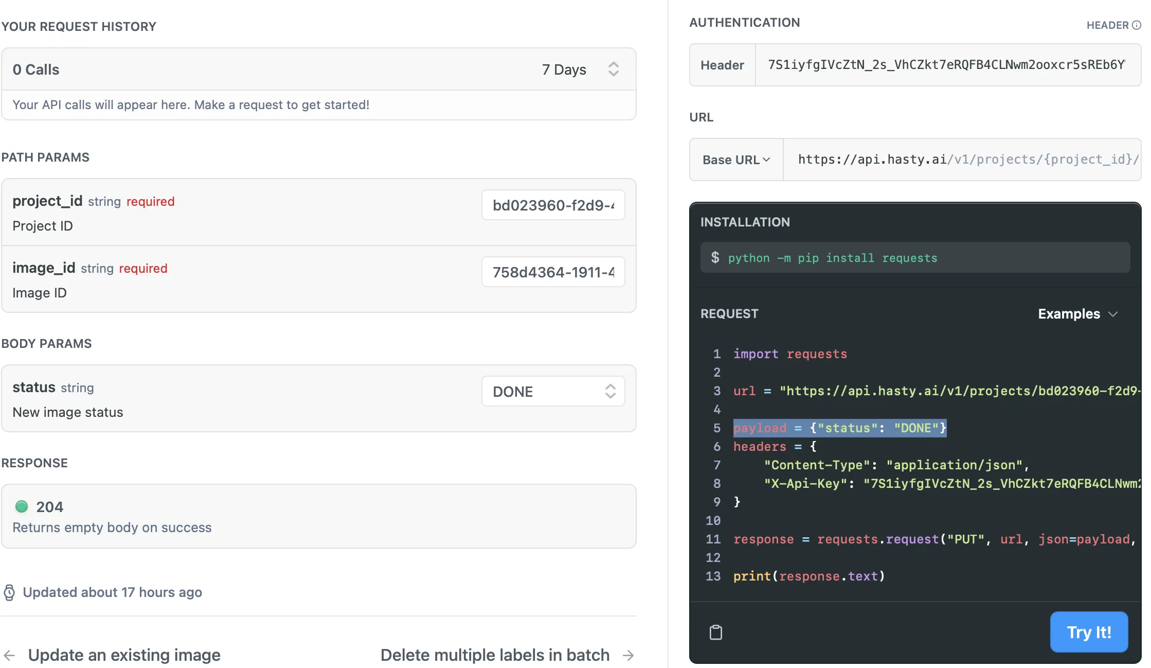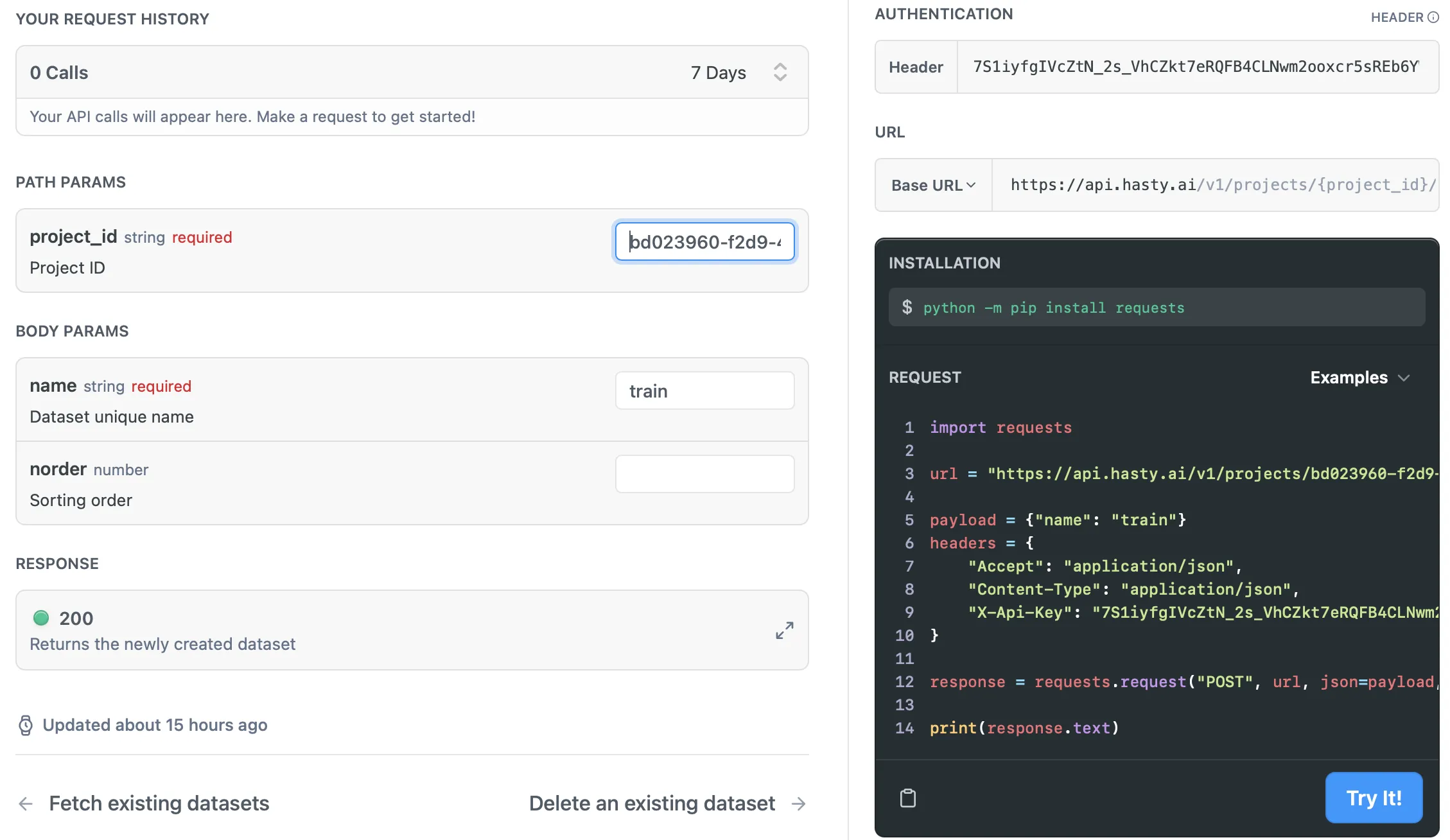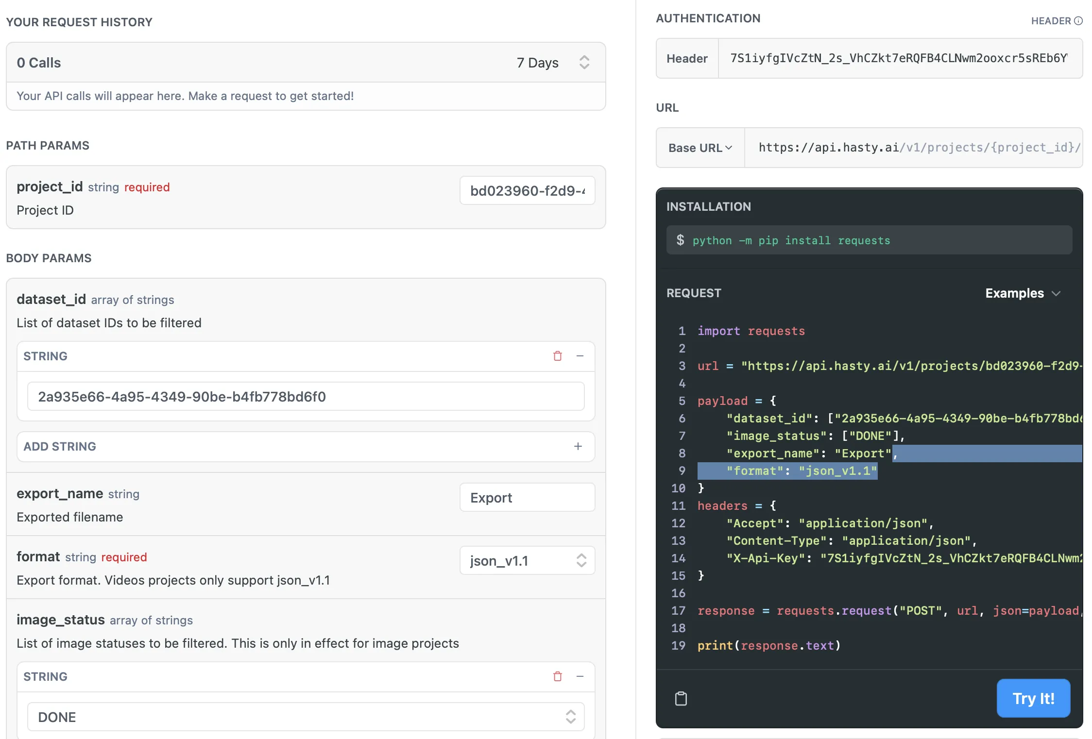 As you might have noticed, the request Python code in the right lower corner instantly updated as soon as you added the necessary parameters to your request. So, if you have all the fields filled in, you can just press the Try It! button to send your request to the API or copy the code to use it somewhere else. In my case, it is a bit more complicated since my URL differs from the default one. So, I will copy the code, adjust it, and send a request to the Hasty API through Google Colab notebook.