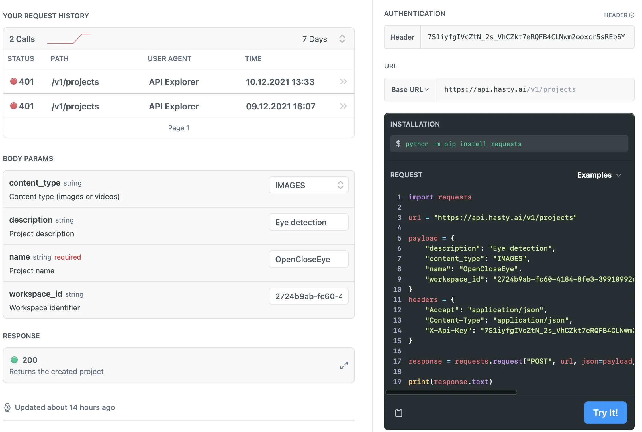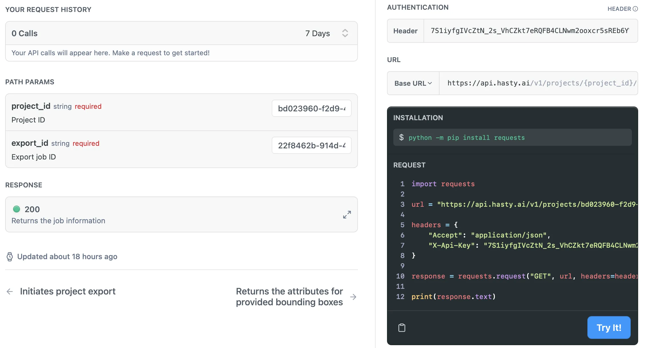 If you ever find yourself in a situation when you do not want to use Hasty’s UI to work on your project, you can always rely on Hasty’s API to help you complete the task programmatically. Still, if you have not worked with APIs before, it might be challenging to tune in and start using an API effectively. Please pay attention to the step-by-step guide and simple examples below if that is the case.