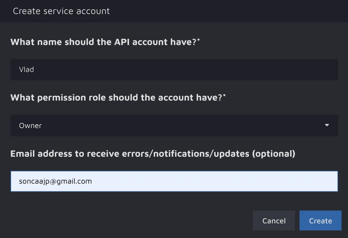 You will see a form for creating a service account which is essentially a virtual user created only for the API. Please fill in all the necessary fields and press the Create button.